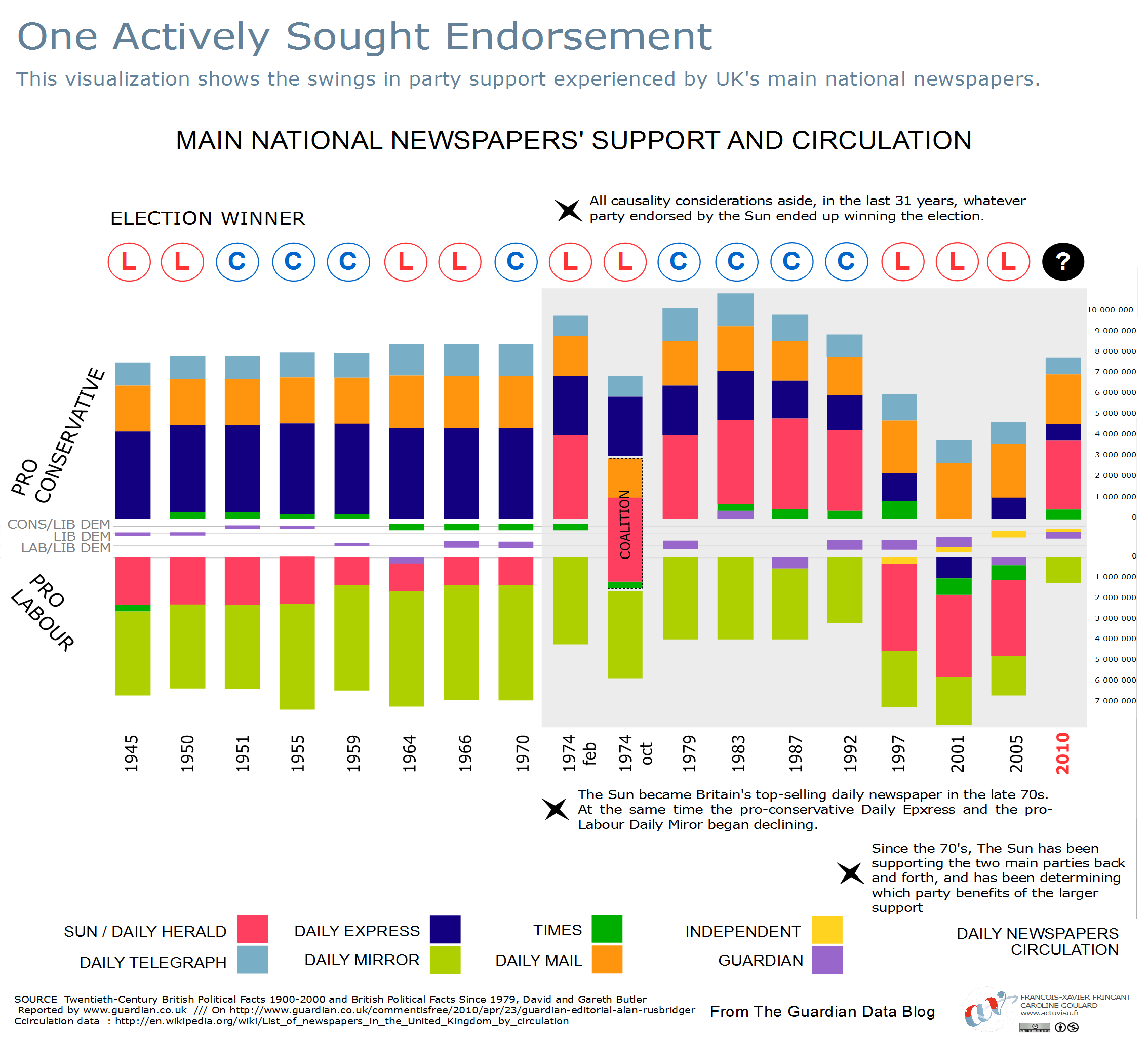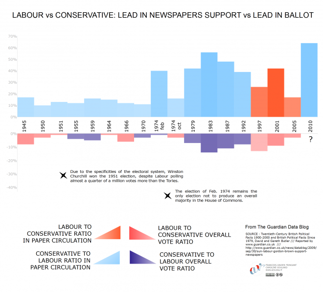 Alors, les magnats des médias ont-ils réellement une influence sur le vote populaire ? Un journal peut-il modifier le cours d’une élection de manière significative ? Ou bien ne fait-il que suivre les opinions de ses lecteurs ? Cette question reste au centre de la compréhension de la politique et elle requiert une analyse profonde que ces visualisations ne prétendent pas atteindre. Nous avons simplement essayé de mettre côte à côte les quotidiens et les partis qu’ils ont soutenus.