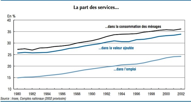 On y apprend d’abord que la catégorie un peu fourre-tout de “services”, qui regroupe par exemple recherche, télécoms, gardiennage, nettoyage, location, juridique, comptabilité, architecture, immobilier, finance, livres, cinéma, e-Education nationale, médecine, hôpitaux… représente aujourd’hui près de 80 % du PIB -mais surtout porte la croissance du PIB-, de la consommation des ménages et plus encore de l’emploi.