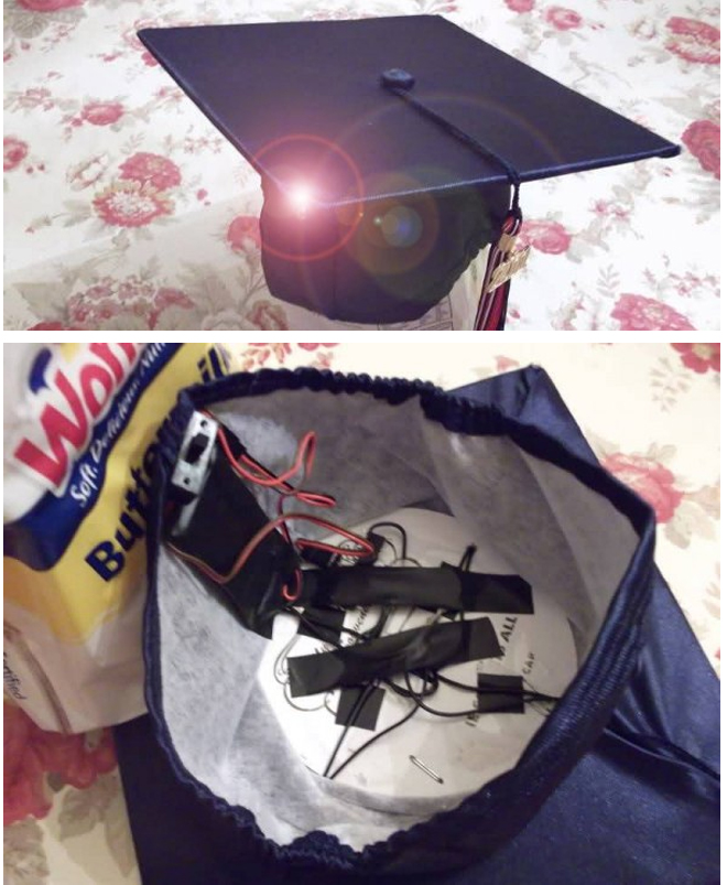 Pour finir notre semaine sur un WTF-HACK-DESIGN, voici le travail d’un jeune américain diplômé d’une école d’électronique. Il a équipé son chapeau de LED infrarouges permettant de reproduire un message en morse. Comme vous le savez peut-être, l’infrarouge est invisible à l’œil nu, ainsi, personne ne l’a remarqué dans la salle, mais tous les appareils photos, les caméras et autres téléphones mobiles auront captés ce message.