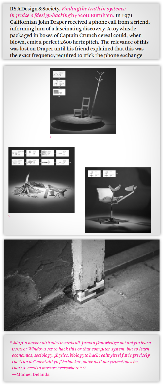 Décidément, cette semaine aura également été riche en écrits sur le rapport design  & hacking. En effet, dans cette brochure, l’écrivain Scott Burnham décrit une vue d’ensemble de ce qu’il appelle le “phénomène du hacking” associé au design. Scott Burnham se demande s’il s’agit simplement d’une autre facette de l’époque post-moderne de l’histoire du design, ou si, au fond, cette tendance ne révèlerait pas une ingéniosité ou une débrouillardise civique que des décennies de consumérisme avait masqué.