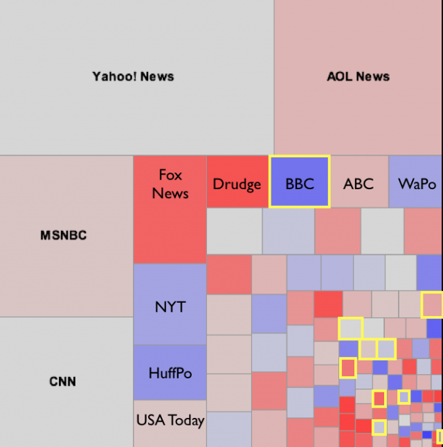 Je m’intéresse moins à la polarisation droite/gauche américaine qu’à la polarisation nous/eux au niveau mondial. À partir des données collectées par Gentzkow et Shapiro, l’équipe de Slate a développé une infographie qui montre la polarisation partisane des petits sites, alors que les plus grands ciblent un public plus large. Je l’ai complétée avec quelques légendes et des cadres jaunes qui montrent quelles sources d’information proviennent d’autres pays que les États-Unis. Vous noterez qu’il n’y a pas beaucoup de jaune sur cette image – la plus grande source d’information internationale, en nombre de pages vues, est la BBC, qui est probablement le site d’information le plus visité sur tout le Web. (Vous noterez aussi que la BBC attire surtout des lecteurs de gauche – avec 22% de lecteurs conservateurs pour 78% de libéraux.)