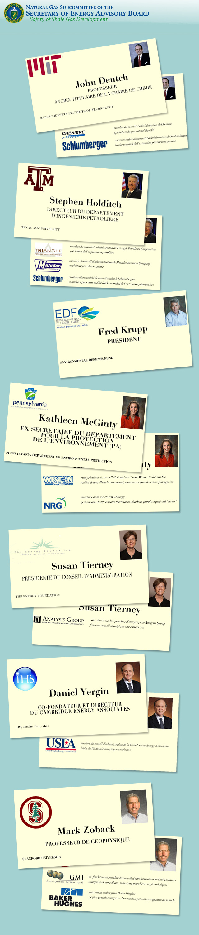 Ce sous-comité aligne de prestigieuses références. Des professeurs éminents du MIT et Stanford, deux des plus grandes universités américaines, y sont assis aux côtés d’anciens pontes du ministère de l’énergie de l’administration Clinton ou de responsables d’ONG. Mais, leur CV respectif fait aussi apparaître des intérêts industriels bien compris et quelques grandes compagnies, toutes intéressées par les gaz de schistes :