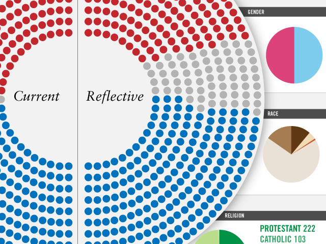 Dans cette infographie, GOOD visualise à gauche ce à quoi ressemble le Congrès actuellement, selon le sexe, la religion, la race1, et l’appartenance politique ; et à droite ce à quoi il devrait ressembler pour être réellement représentatif de la nation. Quelques faits marquants : les femmes occupent actuellement à peine 17% des sièges ; les Américains de type caucasiens (Blancs) représentent 85% alors qu’ils ne devraient représenter que 71%.