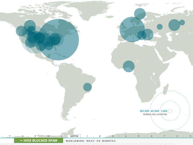 Conçue par Yahoo!, sur Yahoo!, pour Yahoo!, cette visualisation en temps réel est largement promotionnelle. Elle permet d’observer le nombre de mails envoyés chaque seconde par ce service de messagerie, ainsi que le nombre de spams bloqués ou encore les termes clés revenant le plus souvent dans les mails (oui, Yahoo! lit donc tous vos mails). Autrement dit, visualiser la puissance de Yahoo!. Mais ils ont préféré le HTML au Flash qui offre un résultat très lisible, méritant quelques lignes dans notre chronique des nouveaux territoires du journalisme de données.