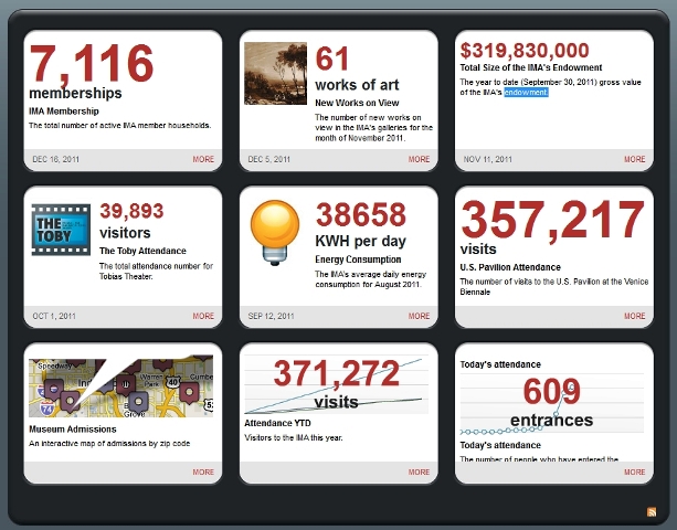 Dernière intrusion en terre étasunienne : un tour rapide du côté de l’ Indianapolis Museum of Art (IMA) qui propose sur son site internet un tableau de bord mettant en scène certaines de ses données : nombre de visiteurs, nombre de nouvelles Å“uvres d’art, consommation énergétique ou encore montant de sa dotation. Chaque entrée permet d’accéder à un article plus complet.