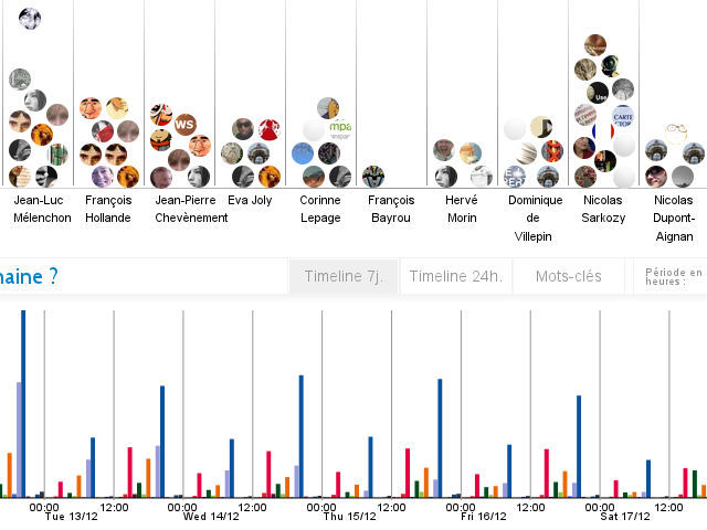 Chaque tweet parlant d’un candidat est représenté par une petite bulle (quand vous la survolez, vous pouvez voir le texte du tweet, son heure, son auteur et la photo de profil de ce dernier) qui vient se loger dans la case correspondant au candidat dont il fait référence. Vous pouvez appliquer différents filtres et mettre sur pause pour explorer plus en détail les tweets, ou voir le récapitulatif sur une semaine ou 24 heures.