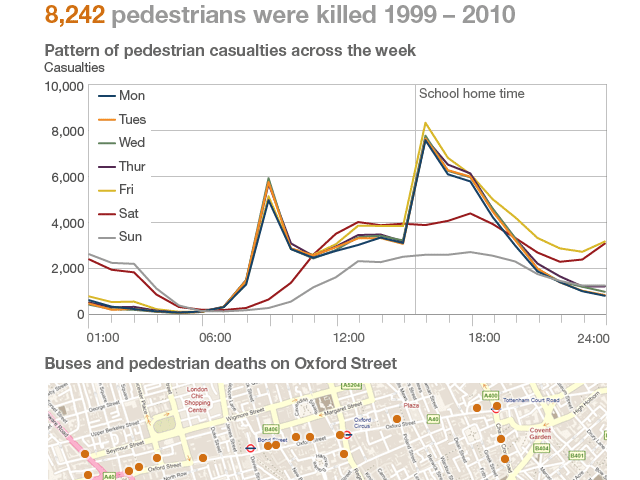 Transports toujours, mais sous un angle moins insouciant. La BBC s’est saisie de l’intégralité des données des décès par accident de la route, au Royaume-Uni entre 1999 et 2010 et en a pondu une web-app particulièrement complète.
