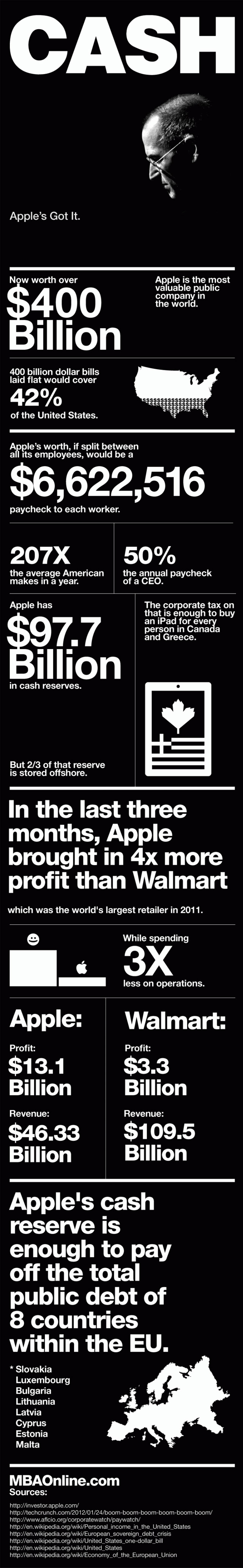 Que feriez-vous avec 97 milliards de dollars d’argent comptant? Personnellement, je ne saurais jamais que faire de tout ceci, mais Apple est actuellement en train de réfléchir à cette question. Cette visualisation de données nous présente quelques comparaisons entre l’argent d’Apple et ce que la société pourrait faire avec… tout est une question de priorité, vous l’aurez compris.