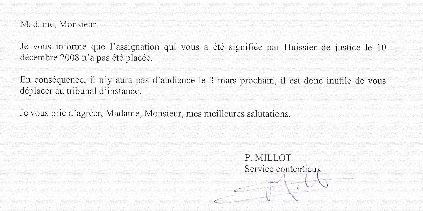 Affaire non placée au Tribunal - Courrier adressé à Saadia Trebol