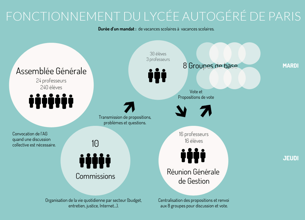 Les structures organisationnelles sont les garantes d’une autre vision de la démocratie. Plus complexe qu’une simple assemblée générale, l’organisation au Lycée autogéré de Paris s’échafaude ainsi autour de différentes instances ayant chacune leur propre rôle sans pour autant être hérmetiques entre elles, bien au contraire. Comme le commente Jérémie: