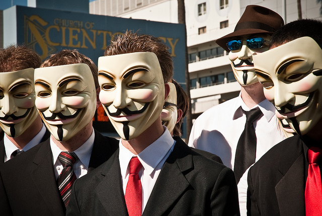 On a trop tendance à l’oublier, mais la figure politique de l’Anonymous est précisément néée, en 2008, pour dénoncer les abus de la Scientologie, avec le projet Chanology qui vit des milliers d’Anonymous manifester devant les locaux de l’église de scientologie.